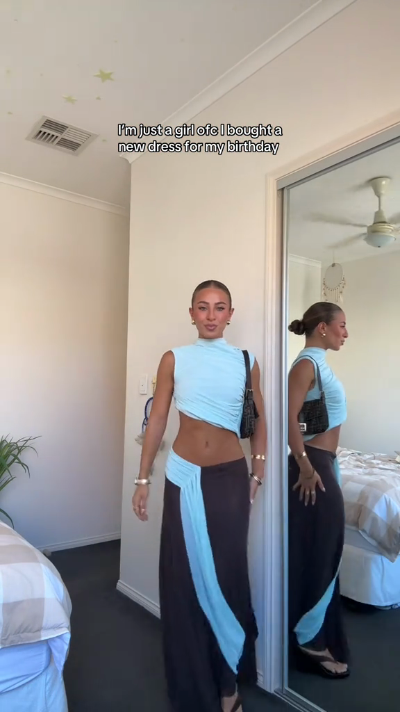 This long dress in sky blue and chocolate brown features a flowing design and smooth lines, exuding elegance and enhancing a modern, minimalist style.