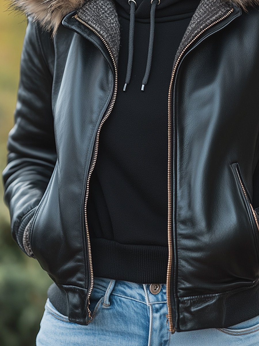 Vintage Leather Wool Warm Windproof Hooded Jacket