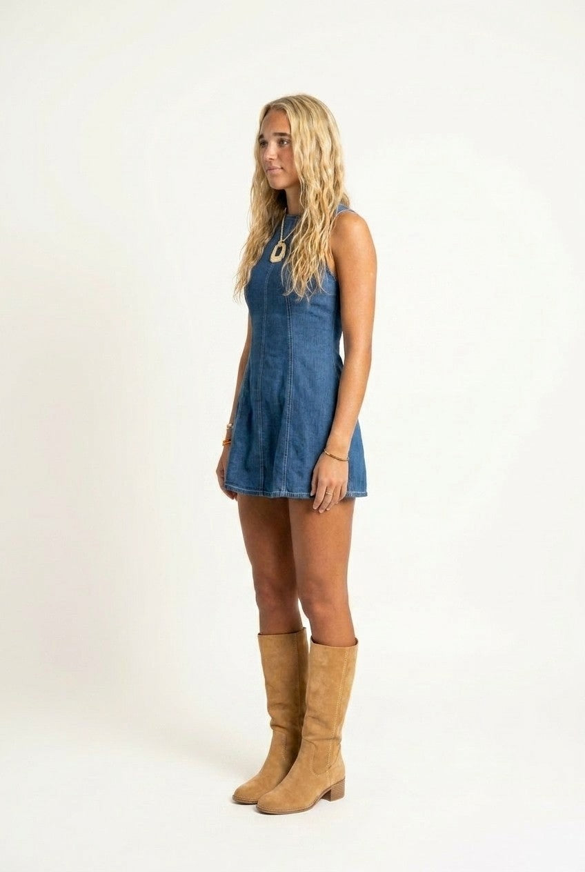 Timeless denim meets a modern silhouette. This sleeveless mini dress is designed with structural vertical paneling to flatter your figure while maintaining a playful, effortless aesthetic.