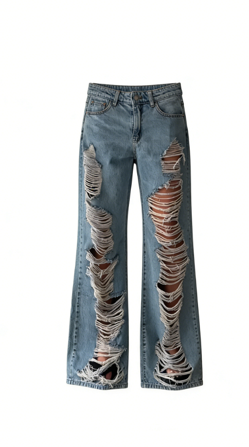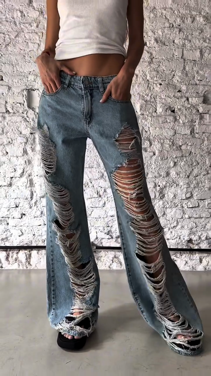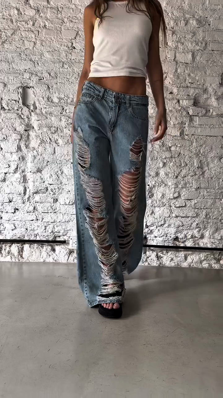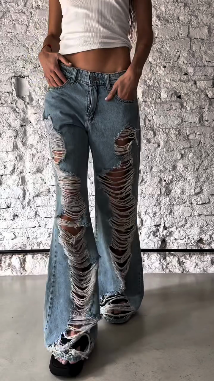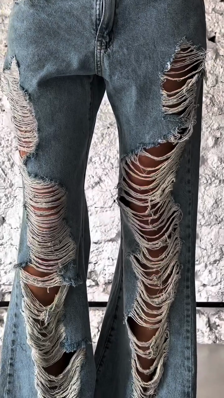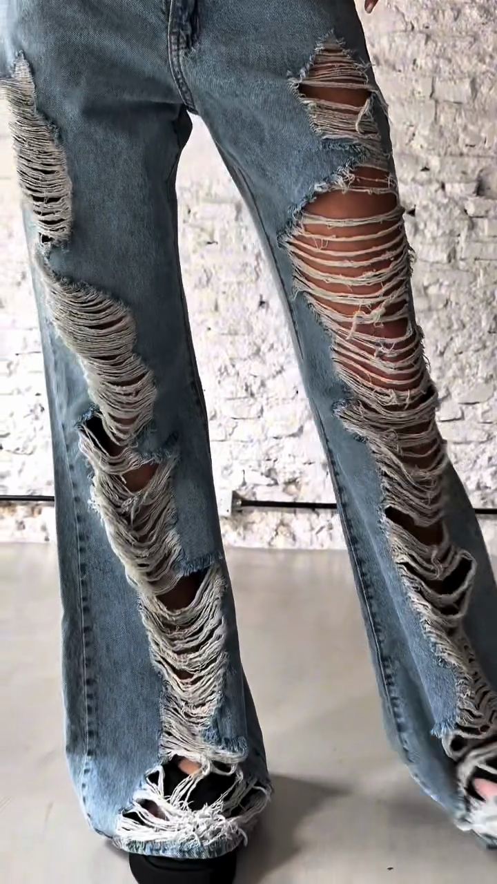 ✅ High-waisted design + exaggerated trapezoidal distressed details at the hem + loose wide-leg fit create a retro and fashionable look.