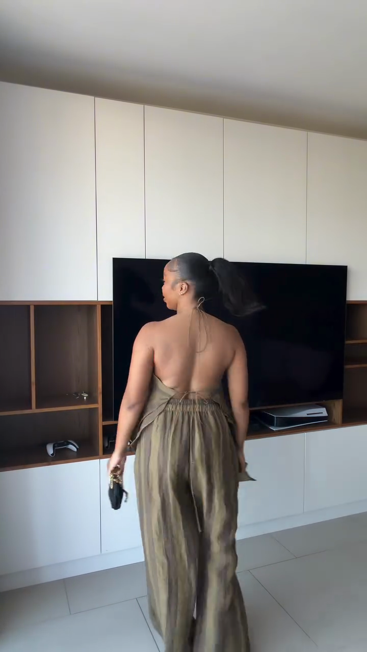✅ The backless camisole top paired perfectly with high-waisted wide-leg pants creates a balanced and flattering silhouette.