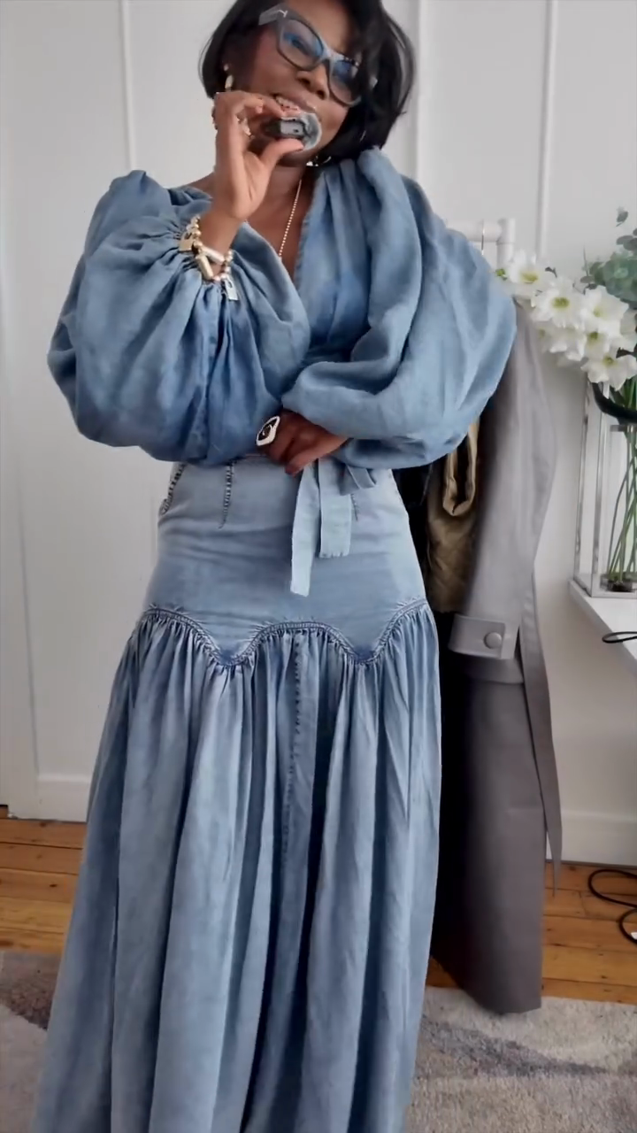 This blue denim suit features a plunging V-neck, puff sleeves, and a long skirt for a stylish look. Elevate your formal look with heels and minimal accessories.